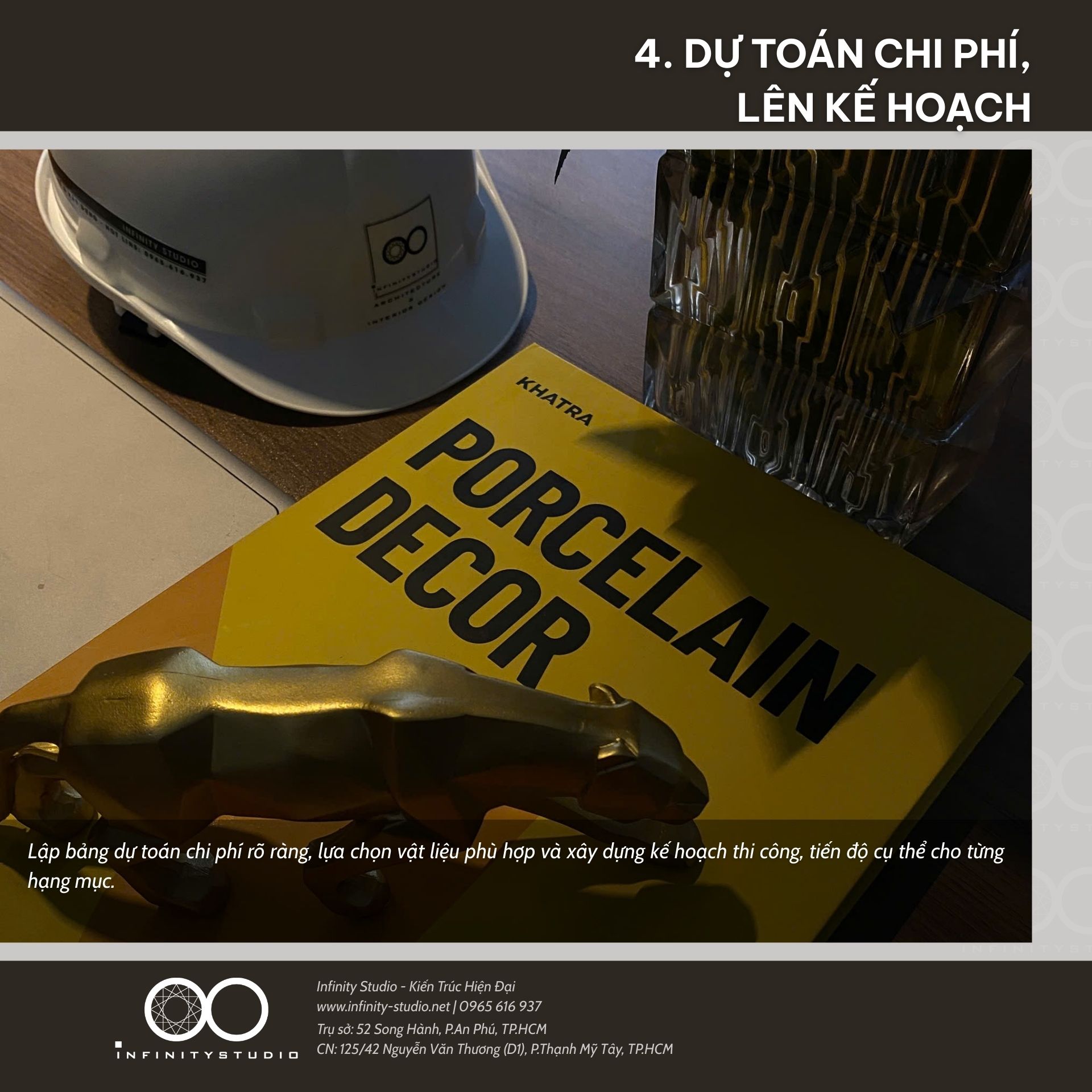Sau khi hồ sơ thiết kế hoàn chỉnh, Infinity Studio lập dự toán chi tiết từng hạng mục, gồm chi phí vật liệu, nhân công và các chi phí liên quan. Bảng dự toán này giúp bạn kiểm soát chi phí đầu tư rõ ràng. Đồng thời, chúng tôi xây dựng kế hoạch thi công và tiến độ dự kiến để đảm bảo công trình triển khai đúng lịch và hiệu quả.