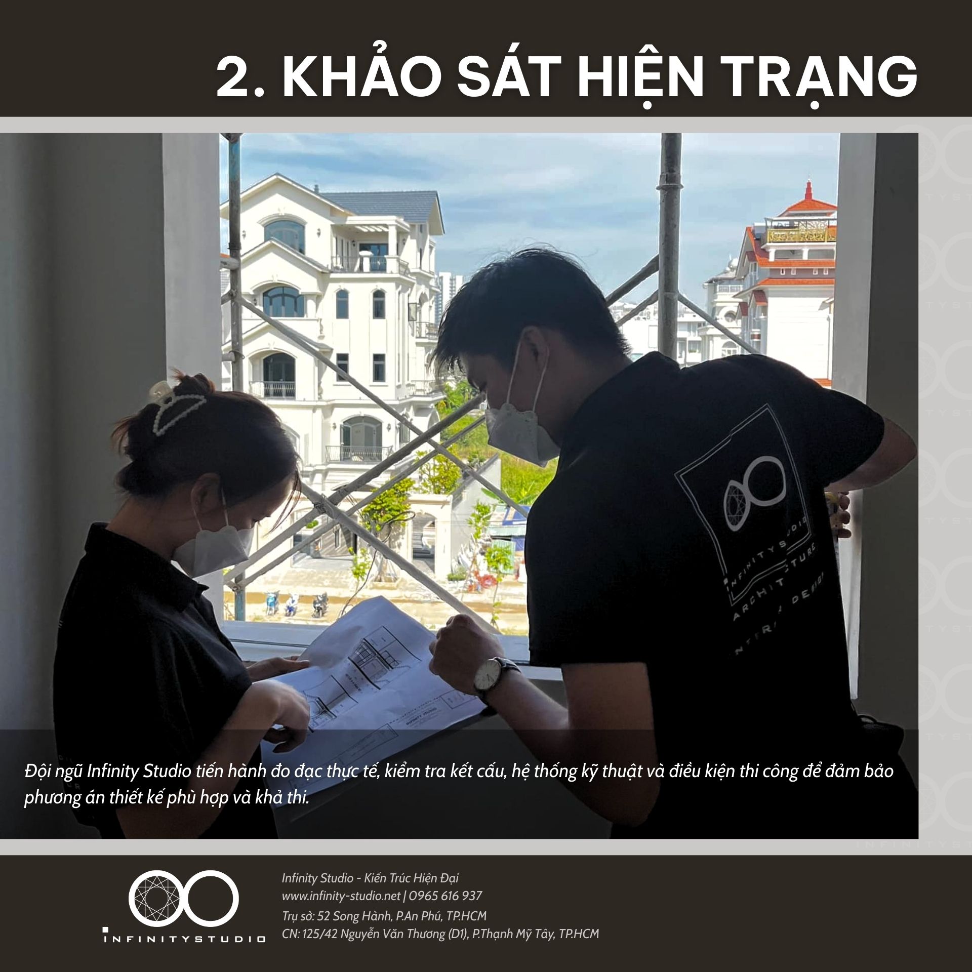 Sau khi tiếp nhận yêu cầu, Infinity Studio tiến hành khảo sát hiện trạng công trình — đo đạc kích thước thực tế, đánh giá cấu trúc, hệ thống điện nước, ánh sáng và các yếu tố kỹ thuật khác. Việc khảo sát chi tiết giúp đội ngũ thiết kế nhìn nhận đúng hạn chế và tiềm năng không gian, là tiền đề để phát triển ý tưởng thiết kế phù hợp với thực tế xây dựng.