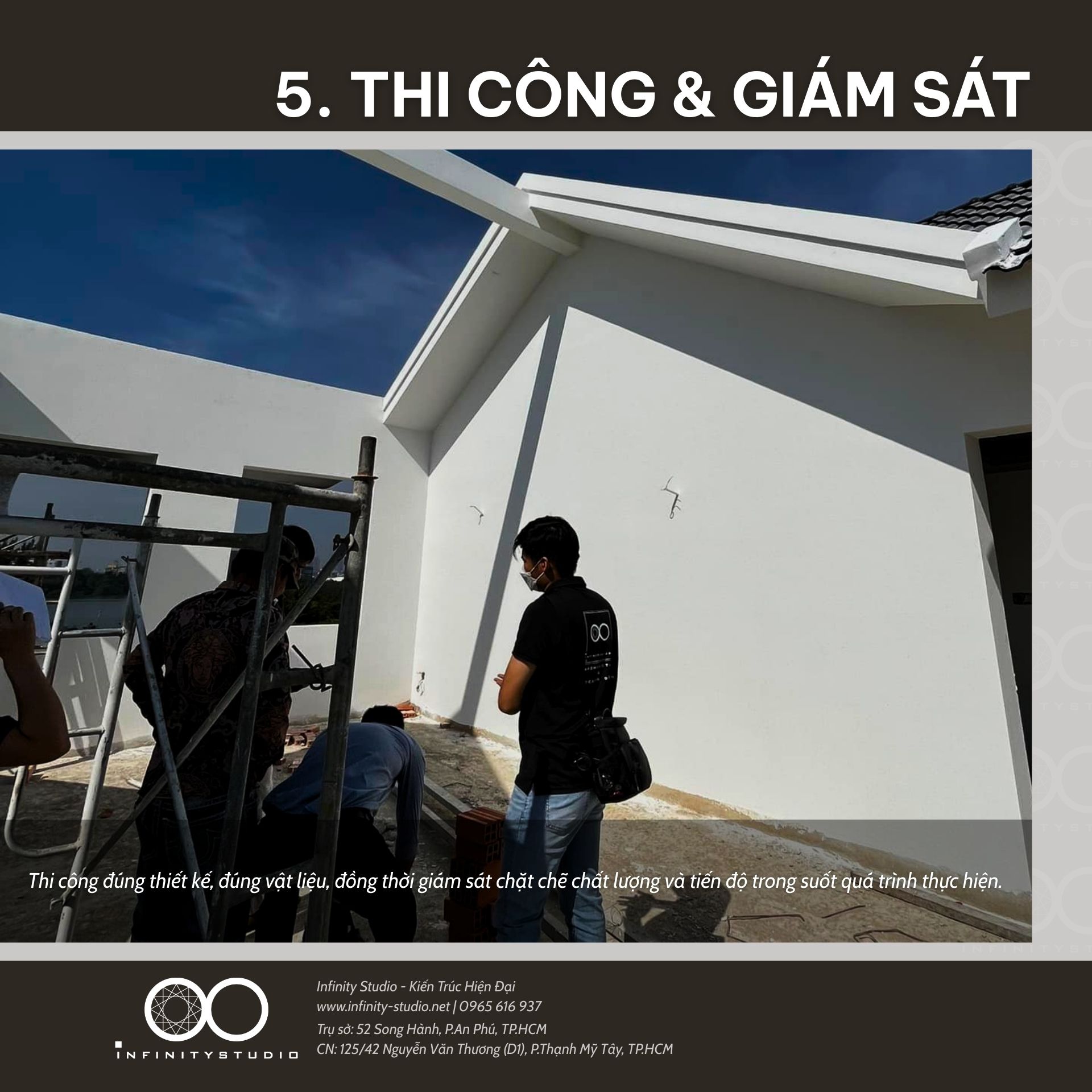 Đây là giai đoạn hiện thực hóa bản thiết kế, Infinity Studio đồng hành cùng đội thi công, đảm bảo mọi hạng mục được thực hiện đúng kỹ thuật và bản vẽ đã duyệt. Quá trình thi công được giám sát chặt chẽ để đảm bảo chất lượng, tiến độ và tính thẩm mỹ cuối cùng.
