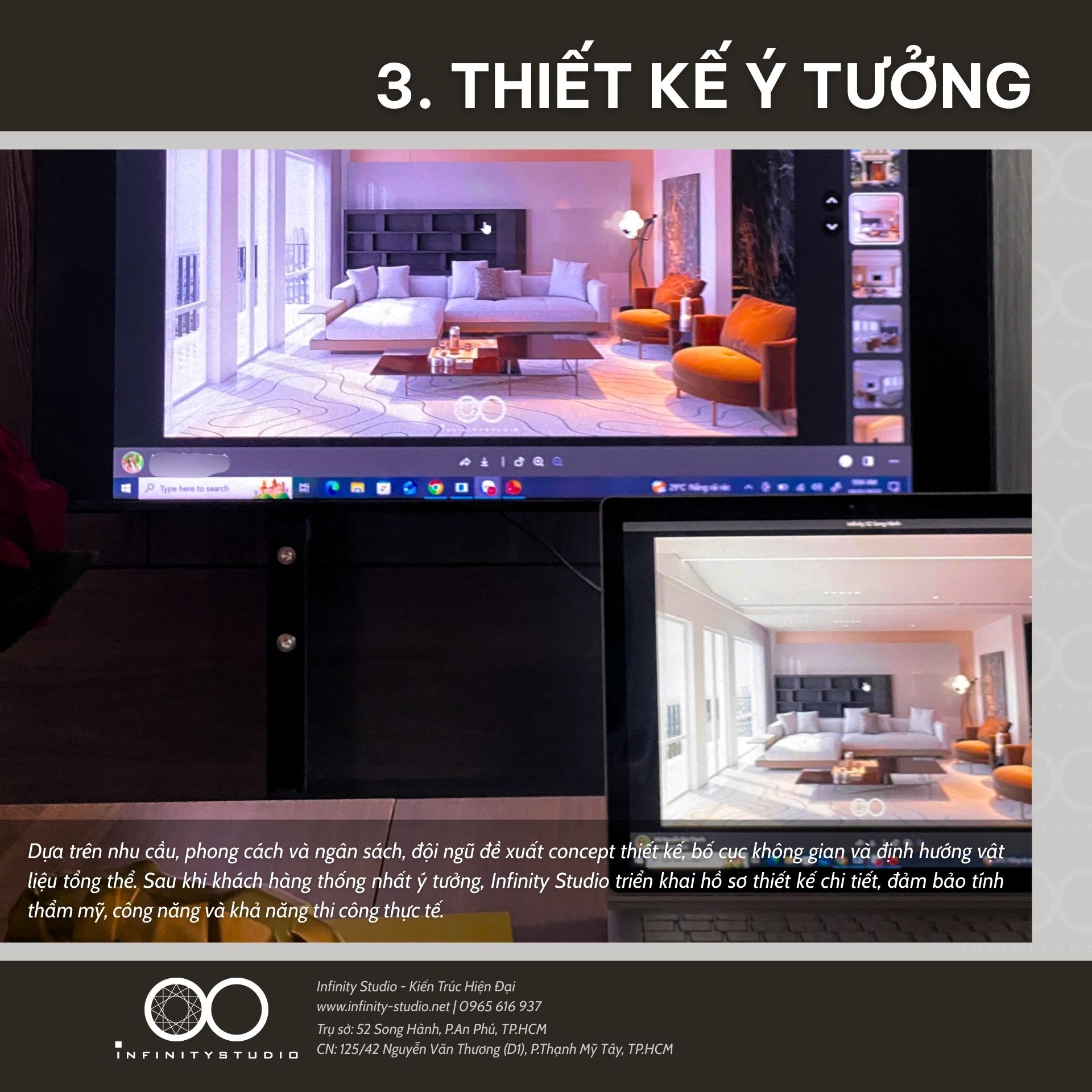 Mỗi dự án bắt đầu từ cuộc gặp gỡ giữa đội ngũ Infinity Studio và khách hàng. Đây là giai đoạn quan trọng để lắng nghe nhu cầu, mong muốn, phong cách yêu thích và ngân sách đầu tư. Dựa trên thông tin này, đội ngũ đưa ra những tư vấn sơ bộ về định hướng thiết kế, vật liệu phù hợp cũng như những giải pháp kiến trúc tối ưu nhất